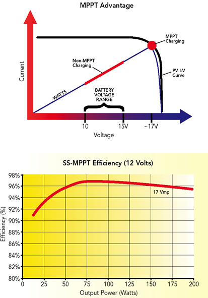 SS-MPPT-15Lは、ソーラーパネルやアレイの総合最大発電電力点を常に追跡、その時々の状況に合わせて電圧を調整し、最も高い電流をバッテリーに送り込みます。